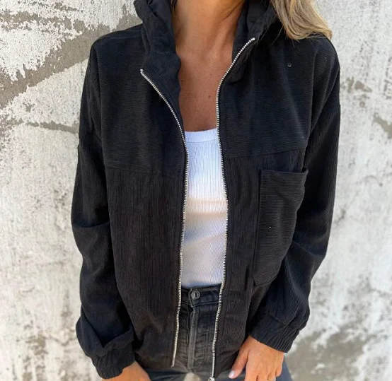 Spring and autumn new solid color jacket women's European and American simple style corduroy hooded