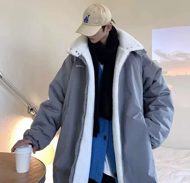 Thickened fleece-lined cotton jacket, simple black hooded coat
