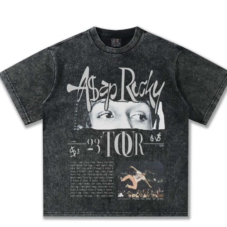 AR street washed, distressed heavyweight fashion brand T-shirt, direct spray print, short sleeves
